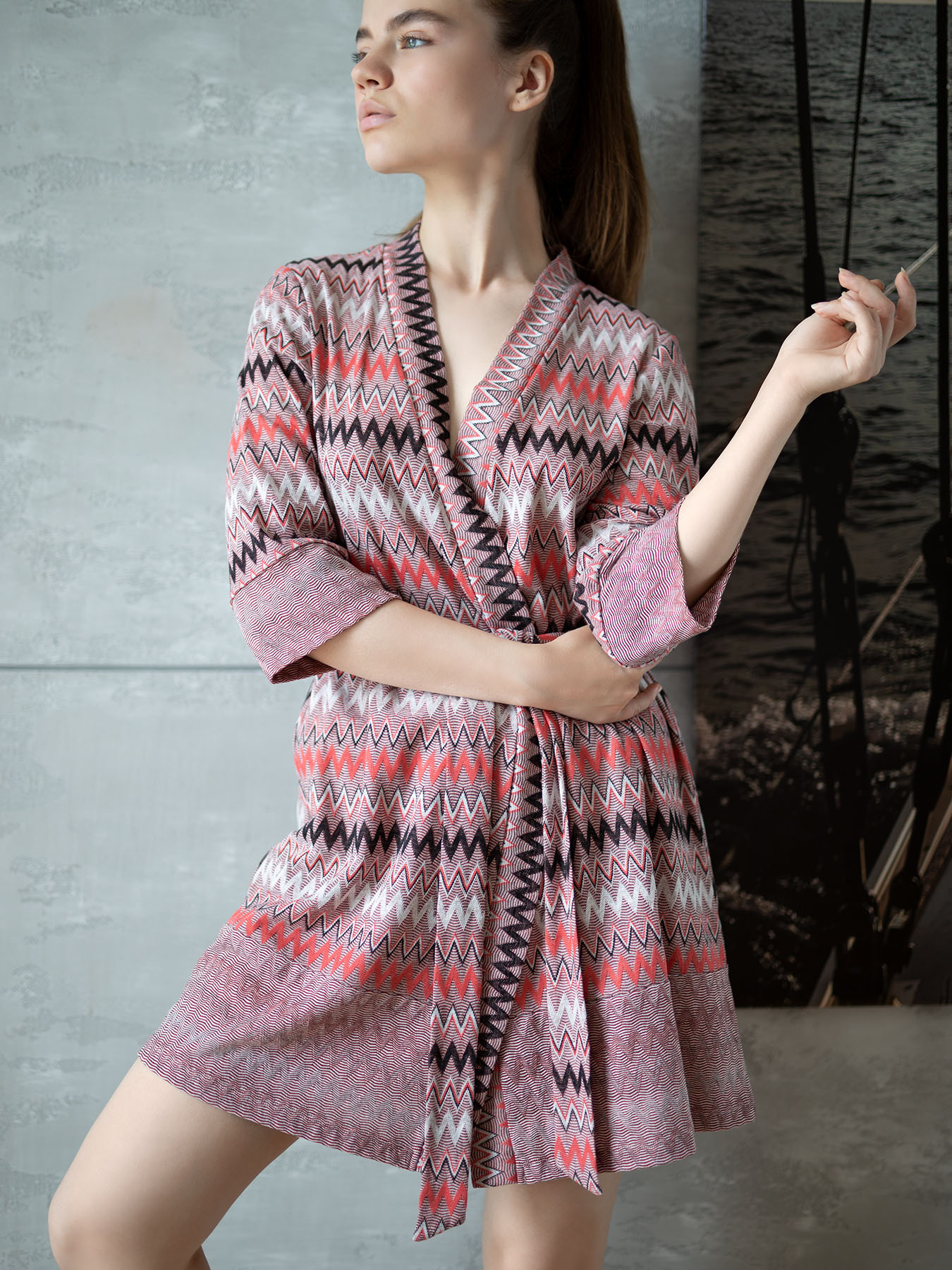 • Женский халат - кардиган из трикотажа на основе вискозы. Оригинальный вязаный узор зигзаг напоминает известный лакшери бренд. Приятное глазу сочетание расцветок нитей, мягкая ткань что еще нужно для идеальной домашней одежды?