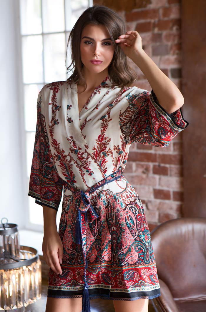 • Халат МиаМиа средней длины прямого силуэта с V-образным вырезом горловины на полочке и рукавами длинной 7/8, выполнен из вискозы с фантазийным принтом. Халат завязывается на пояс, отделанный однотонным кантом из мелкого кружева контрастного цвета. Кисти на поясе великолепно сочетаются с принтом на ткани и придают модели восточный стиль.