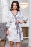 Запашной халат Mia-Mella на поясе с рукавом ⅞. Низ рукавов и полы декорированы мережкой и кантом из ткани-компаньона. В комплекте два пояса — светлый и темный.