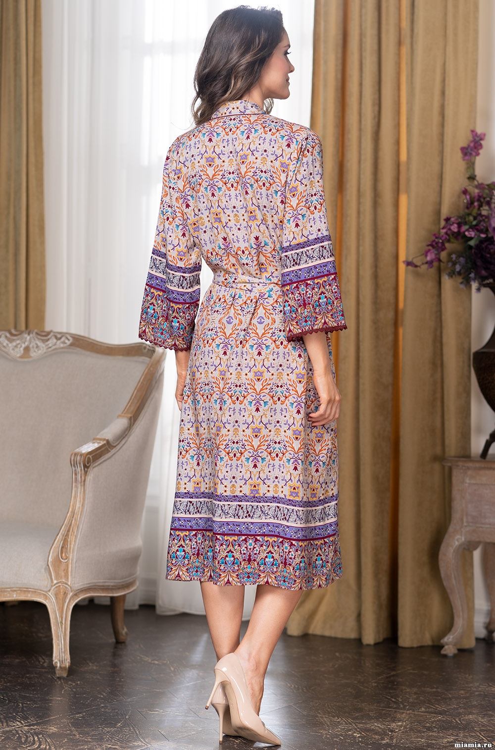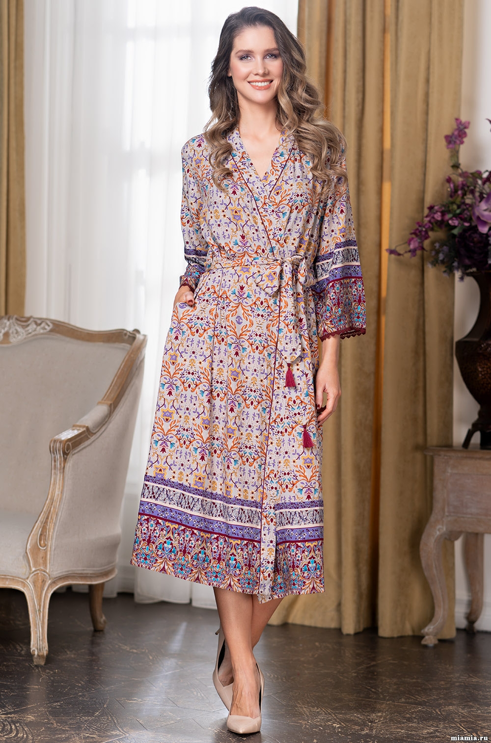 Классический длинный запашной халат Mia-Amore с рукавом длиной 7/8, выполнен из вискозы с купонным принтом. В боковых швах обработаны карманы. Узкое кружево украшает низ рукавов. Тонкий контрастный кант проходит вдоль бортов.