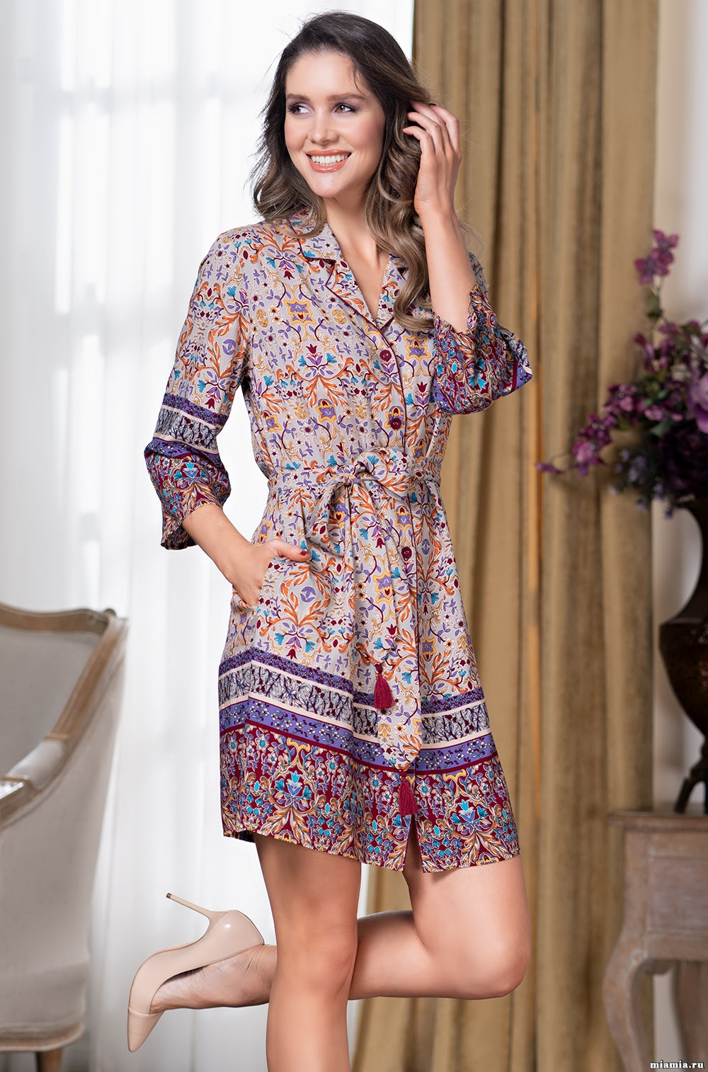 Халат Mia-Amore на пуговицах с рукавом длиной ¾, выполнен из вискозы с купонным принтом. По воротнику и линии борта халата проходит контрастный кант. В боковых швах обработаны карманы, а по низу разрезы. Линию талии можно подчеркнуть за счет пояса с кисточками, который идет в комплекте.