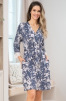 Короткий халат Mia-Amore с рукавами длиной ¾ и центральной застежкой на пуговицы выполнен из трикотажного принтованного полотна. Низ рукавов декорирован нежно-розовым кружевом. В боковых швах карманы.
