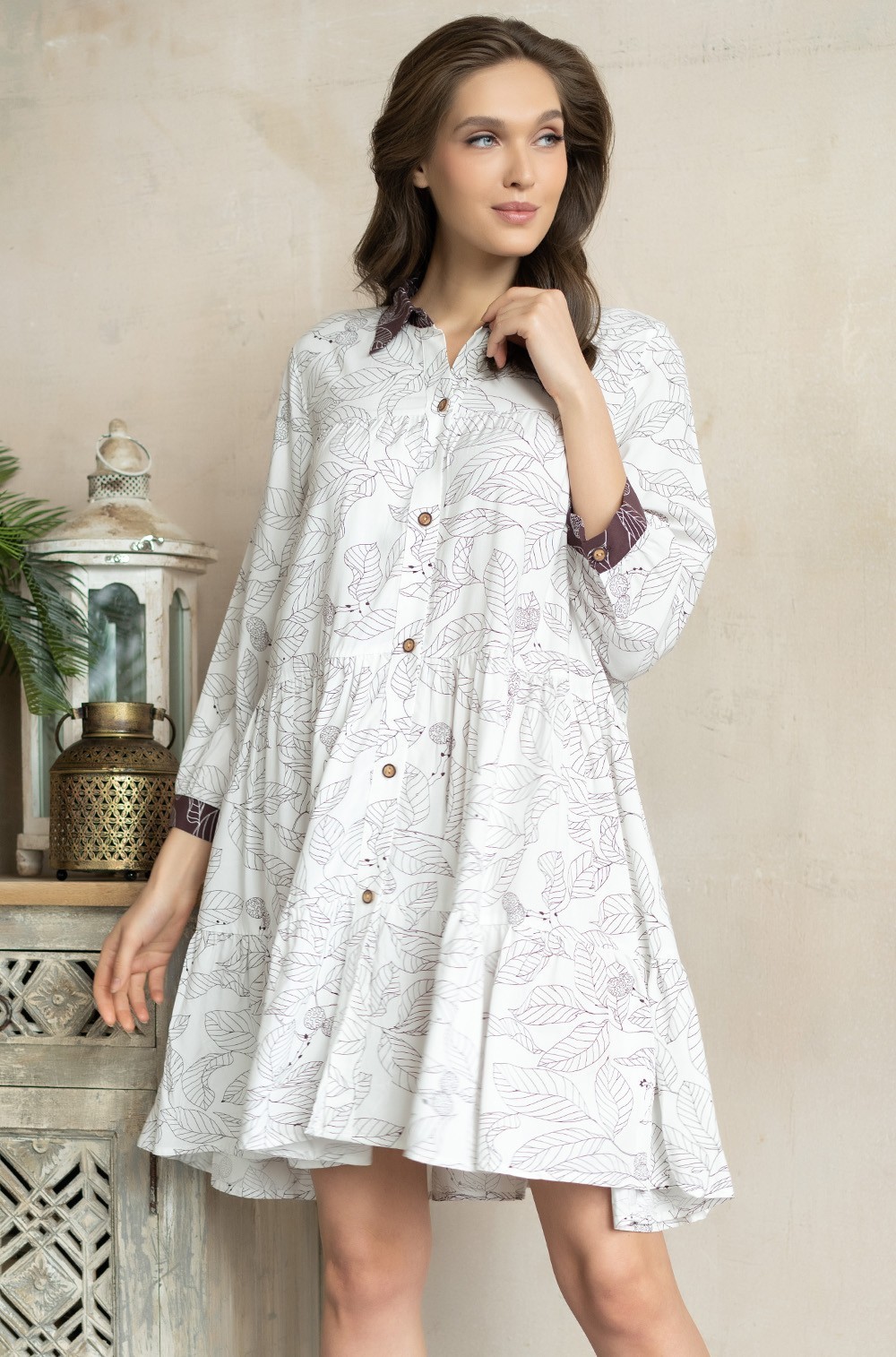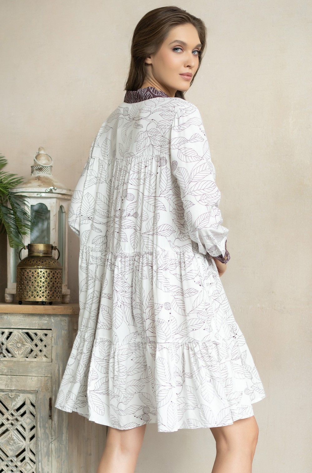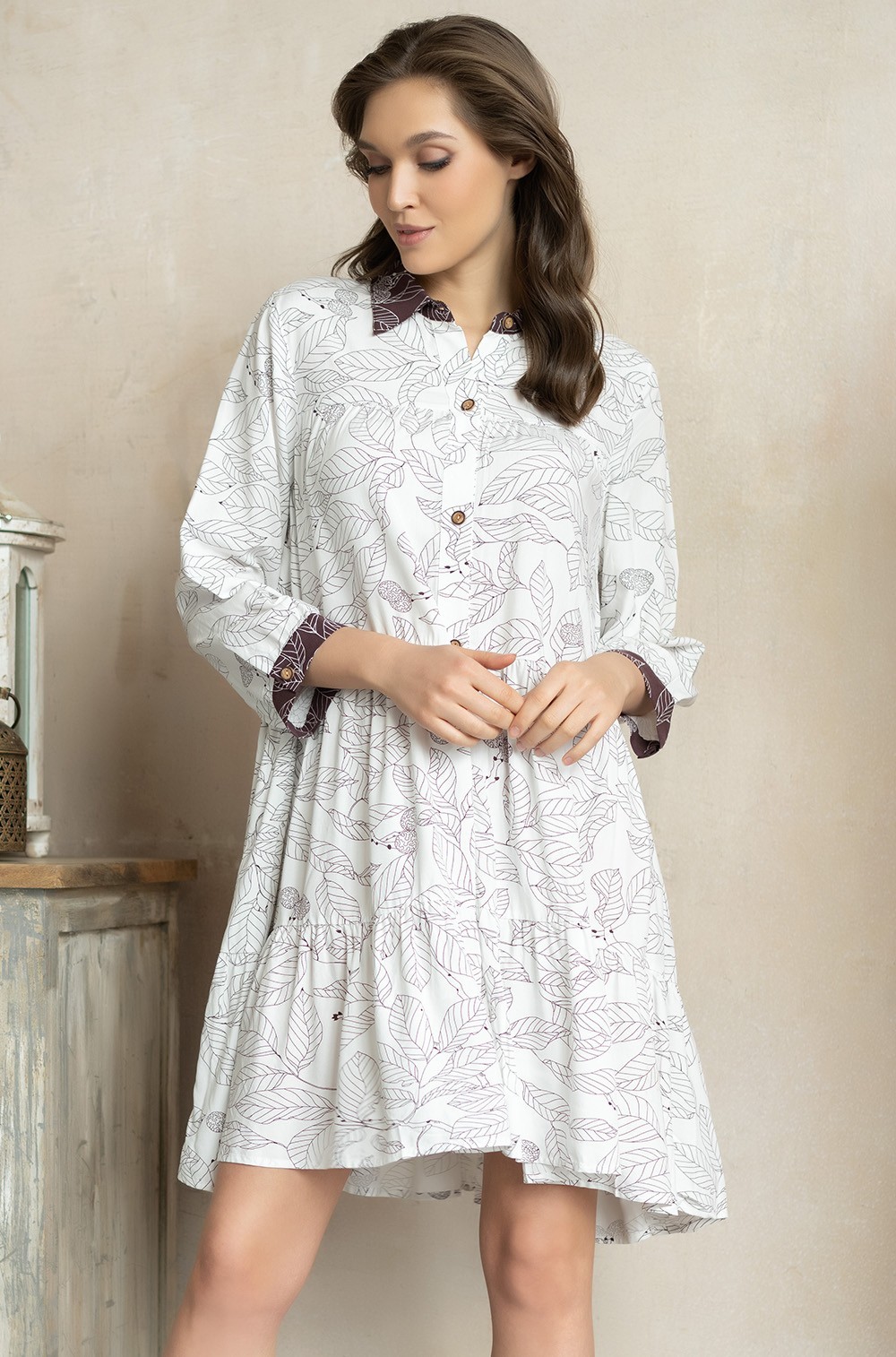Рубашка женская домашняя Mia-Amore с центральной застежкой на пуговицы, с рукавами длиной 3/4 выполнена из светлой принтованной вискозы. Эта свободная ярусная модель в стиле бохо уже стала фаворитом многих наших коллекций. Летящий силуэт украсит любую фигуру. Манжеты и воротник выполнены из тёмного компаньона. Домашняя туника женская подойдёт как подарок любимой девушке, жене, сестре, подруге или маме. Женская рубашка-платье свободного силуэта в размерах от 42 до 54- поэтому подойдёт женщинам любого роста. Рубашка женская трикотаж красиво сидит на любой фигуре, подчёркивая её достоинства. Красивая удобная домашняя одежда прекрасно подойдет для дома, отдыха, больницы и родов.