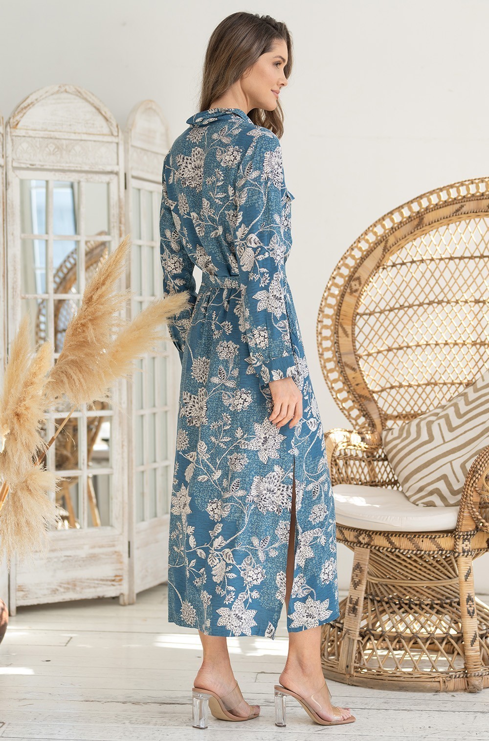 Длинная рубашка-платье Mia-Amore прямого силуэта из натуральной вискозы. Платье длиной до щиколотки, спереди застегивается на пуговицы, на груди два накладных кармана с клапанами. Воротник отложной со стойкой. Длинные рукава подворачиваются и фиксируются хлястиком. В боковых швах карманы, внизу высокие разрезы. В комплект идет пояс, чтобы еще больше подчеркнуть женственный силуэт.