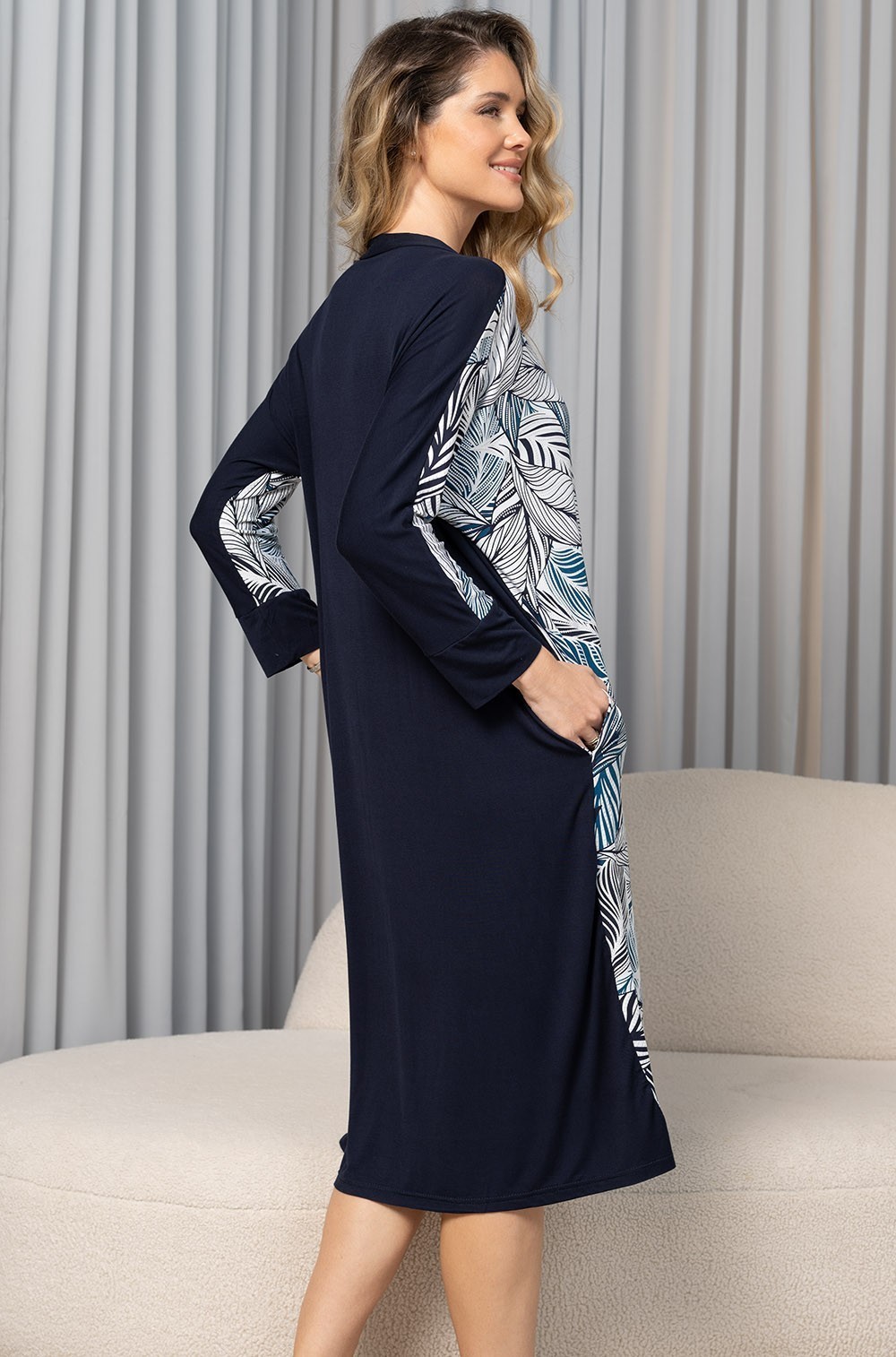 -Дизайн: Длинный халат с застежкой на пуговицы и длинным рукавом.