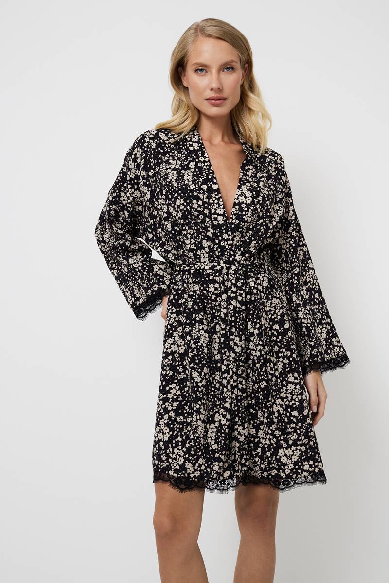 Запашной домашний халат Eli — это потрясающее сочетание элегантности и женственности. Создан из лёгкой вискозы с изысканным цветочным узором, этот халат станет вашим незаменимым спутником для уютных домашних моментов. Изысканный халат украшен длинными рукавами и замысловатыми чёрными кружевными деталями вдоль рукавов и нижнего края, что придаёт ему нотку романтики и утончённости. Халат Eli идеально подходит для любого случая, окутывая вас изящной изысканностью и роскошным комфортом, благодаря чему вы будете чувствовать себя великолепно.