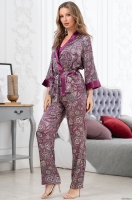 Комплект-тройка Mia-Amore состоит из запашного жакета с длинным рукавом, брюк и топа на тонких бретелях. Жакет и брюки выполнены из принтованного искусственного шелка, а топ из однотонного. Линия талии подчеркнута поясом.