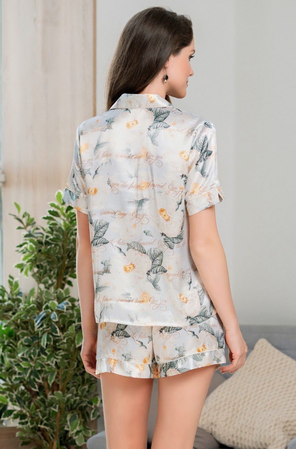 Комплект Mia-Amore состоит из рубашки с центральной застежкой на пуговицы с короткими рукавами и шорт. Комплект выполнен из искусственного принтованного шелка. Жакет и шорты оформлены кантом.