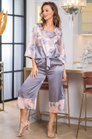 Комплект Mia-Amore состоит из блузы с рукавами длиной ¾ и брюк-капри. Оригинальная блуза с декоративным бантом спереди выполнена из цветовых блоков – принтованного и однотонного искусственных атласов. Низ укороченных однотонных брюк декорирован широкой отделкой из принтованного атласа.