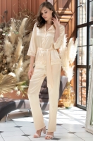Комплект Mia-Amore состоит из жакета с рукавом ¾ и брюк. Комплект выполнен из однотонного искусственного шелка с блеском. Кружевные вставки украшают низ рукавов и низ жакета, а также концы пояса. По бокам брюк расположены карманы. Линию талии можно подчеркнуть за счет пояса, который идет в комплекте.