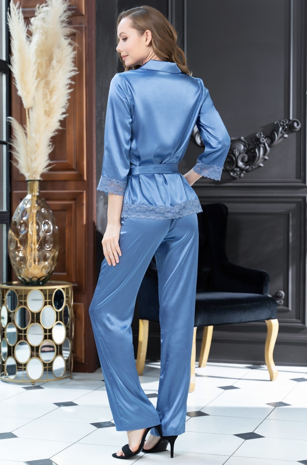 Пижама-двойка женская Mia-Amore состоит из жакета с рукавом ¾ и брюк. Комплект выполнен из однотонного искусственного шелка с блеском. Кружевные вставки украшают низ рукавов и низ жакета, а также концы пояса. По бокам брюк расположены карманы. Линию талии можно подчеркнуть за счет пояса, который идет в комплекте.