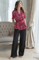 Комплект-тройка Mia-Amore состоит из жакета c короткими рукавами, топа и брюк. Топ и брюки выполнены из однотонного искусственного шелкового полотна с атласным блеском, а жакет – из принтованного. По талии жакет запахивается на пояс, в боковых швах брюк обработаны карманы.