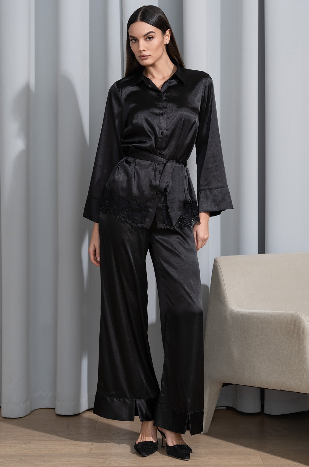 Элегантный домашний комплект Mia-Amore из чёрного искусственного шёлка, состоящий из жакета на пуговицах с длинными рукавами и широких брюк, будет идеальным выбором для комфортного отдыха. Изящный кружевной декор на подоле жакета и широкий пояс, который идёт в комплекте, помогут подчеркнуть вашу талию. Доступен в следующих размерах: S, M, L, XL, 2XL. Состав ткани: 100% полиэстер.