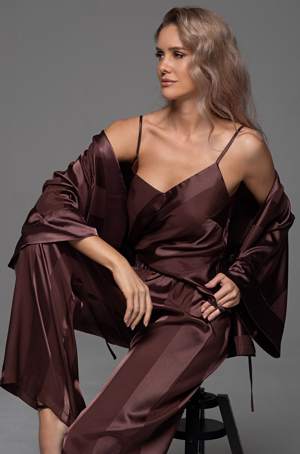 Тип Пижама с брюками Цвет Коричневый Модель Комплект жакет, топ, брюки Материал Полиэстер