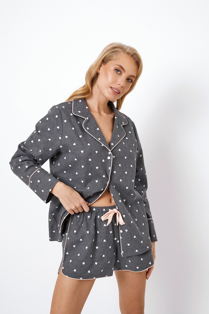 • В настроении для чего-то игривого, но в тоже время романтичного? Коллекция Джой - идеальный выбор для вас! Изделие изготовлено из мягкой и теплой хлопковой фланели с игривым рисунком в виде сердечек. Верх украшен окантовкой воротника и манжета. В то время как пижамные шорты с округленными краями украшены окантовкой по бокам и краям. Шорты также имеют эластичный пояс и могут быть дополнительно завязаны регулируемым атласным бантом.
