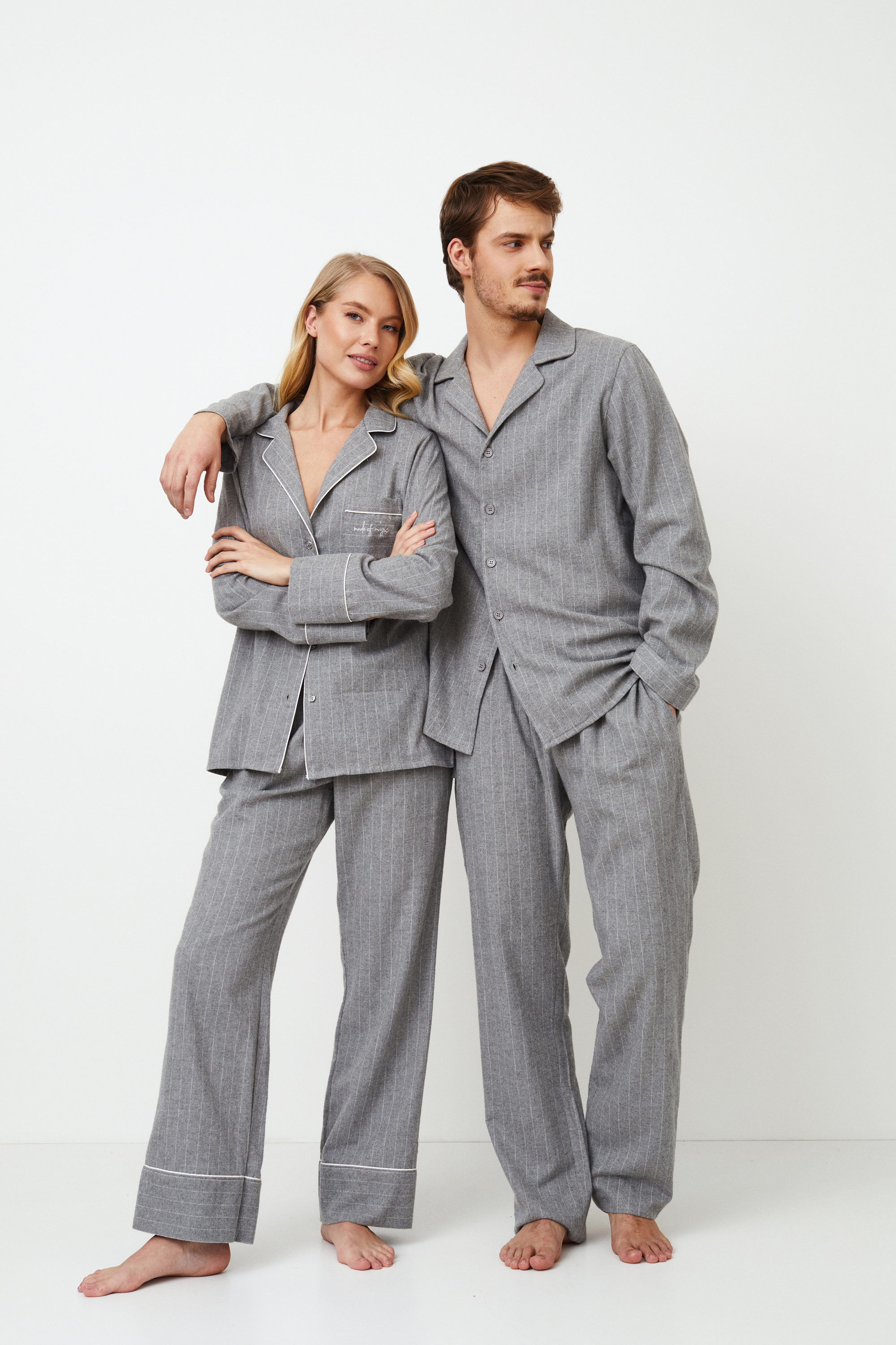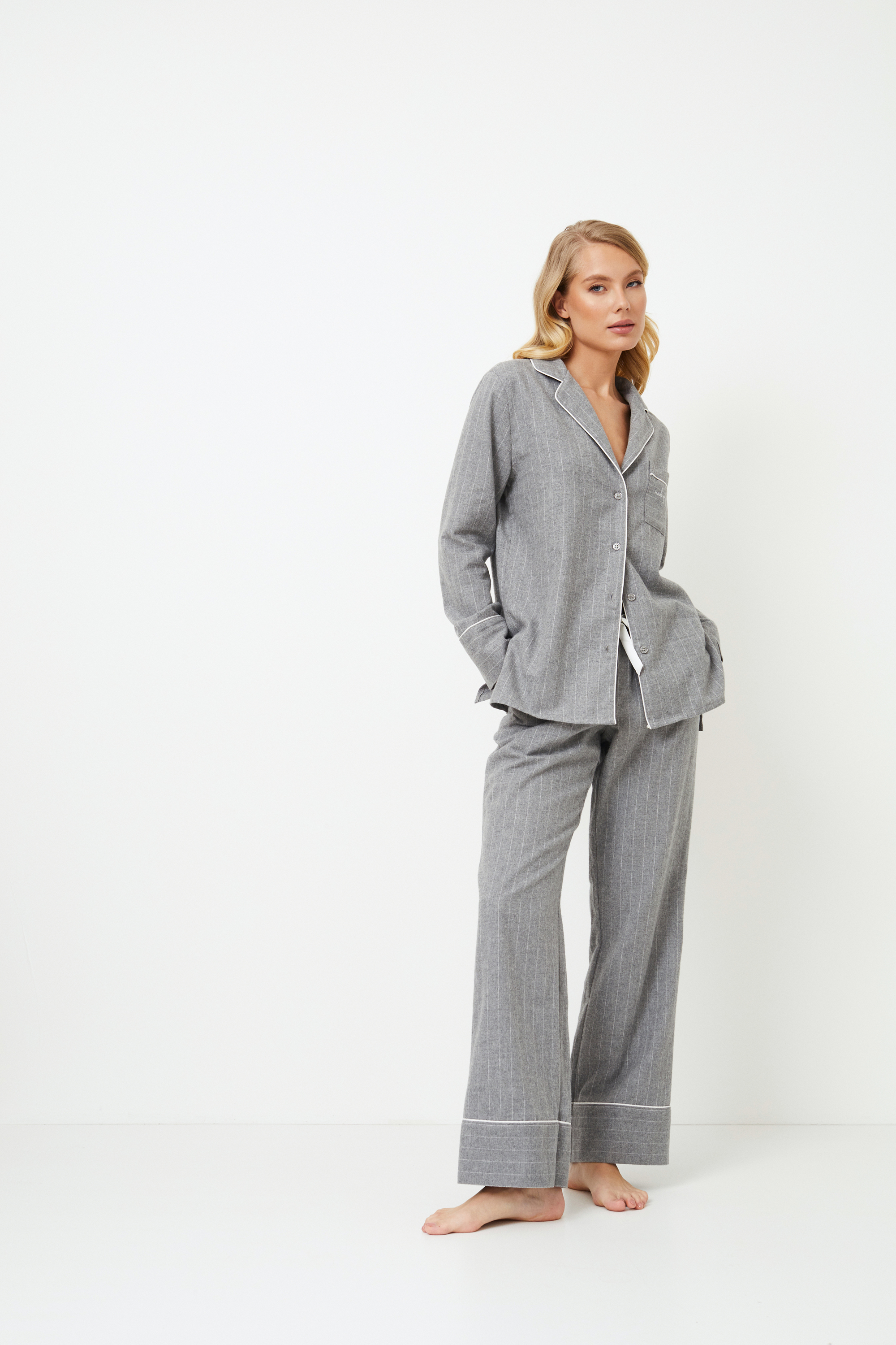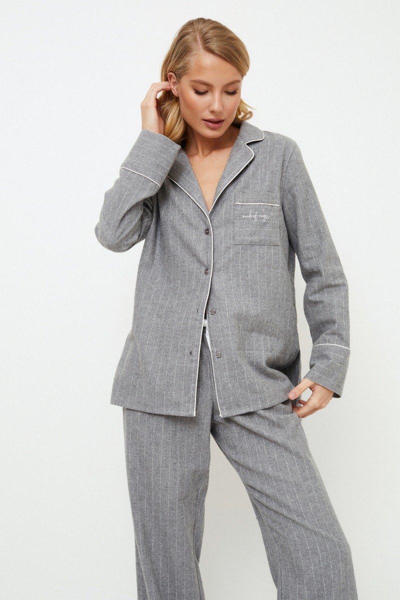 Представляем вашему вниманию длинную пижаму Clara, которая всегда будет незаменима для вашего ночного отдыха. Этот пижамный комплект, выполненный из мягкого хлопка спокойного серого оттенка в тонкую полоску, имеет классический вид, который никогда не выйдет из моды. Топ с длинными рукавами, застегивающийся на пуговицы, имеет простой, но элегантный v-образный вырез горловины, нагрудный карман, украшенный красивой вышивкой "Сделано по волшебству", и манжеты рукавов, отделанные кантом. В сочетании с широкими брюками с кантом по низу и удобными карманами этот комплект излучает сдержанную элегантность. И не забудьте порадовать свою вторую половинку стильным нарядом — купите пижаму Carl pajama long, потому что кто сказал, что перед сном нельзя устроить показ мод для двоих?