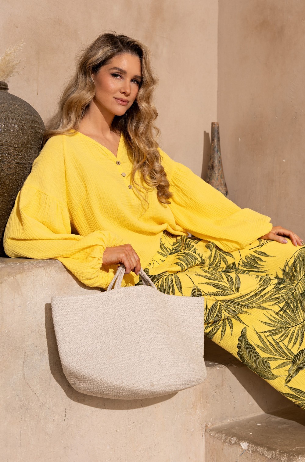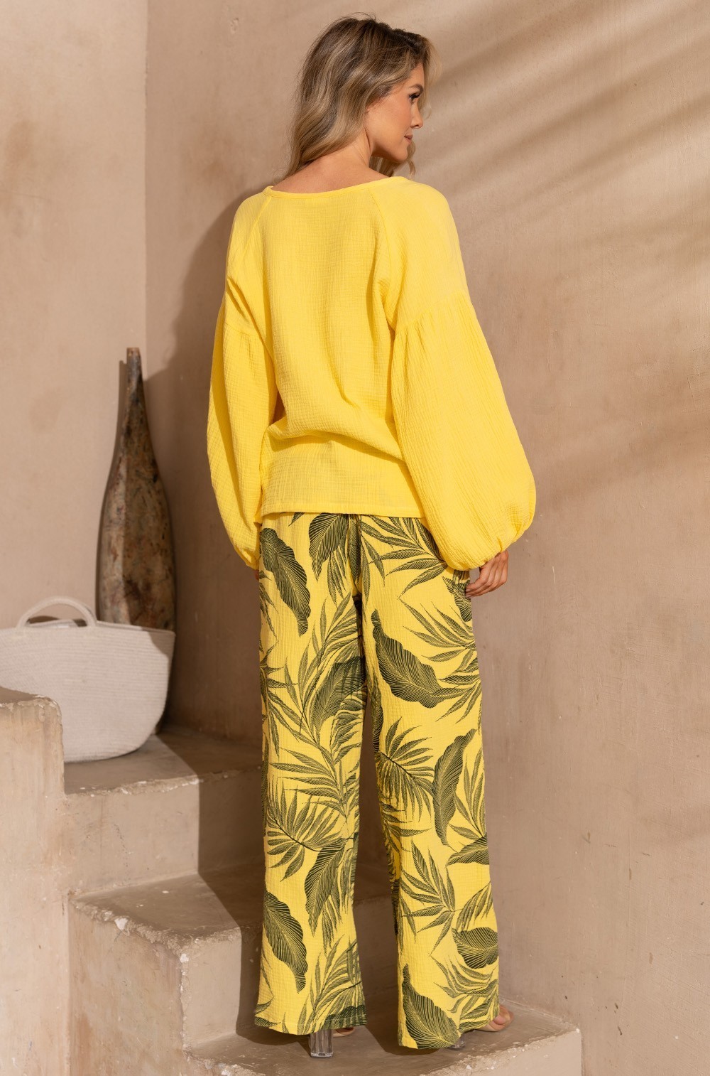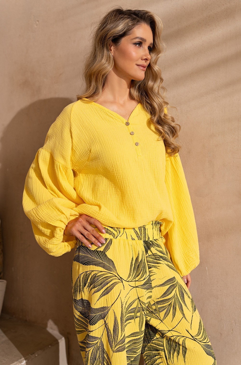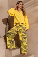 Стильный женский летний костюм TENERIFE 5226 Mia-Amore — идеальный выбор для отдыха. Он состоит из блузы свободного силуэта с длинным пышным рукавом и широких брюк. Блуза выполнена из однотонного муслина, а брюки — из принтованного материала. Модный дизайнерский комплект подойдёт девочкам-подросткам, молодым девушкам и взрослым женщинам любого роста и комплекции.