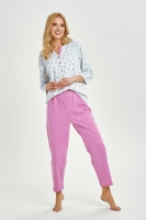 Пижама женская со штанами. Футболка с рисунком из вискозы, рукав 7/8, вырез горловины с планкой на пуговицах. Брюки длинные, хлопковые, пояс эластичный. Состав: верх 94 хлопок, 6 эластан; низ 100 хлопок.