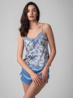 • Пижама с шортами выполнена из смесового шелкового полотна. Топ спереди и на спинке, а так же низ шорт декорированы вышивным ажурным мягким кружевом (не во всех моделях). Состав ткани пижамы: 70% натуральный шелк, 25% полиэстер, 5% эластан.