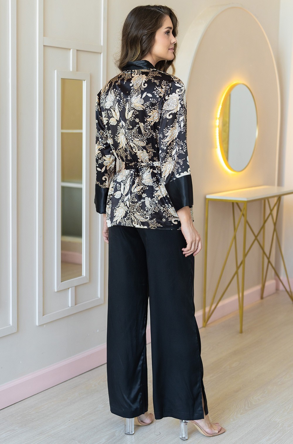Пижама-тройка запашной жакет топ и чёрные брюки шёлк Ясмина 3985 Mia-Amore имеются в размерах: S. M. L. XL.2XL. 3XL.