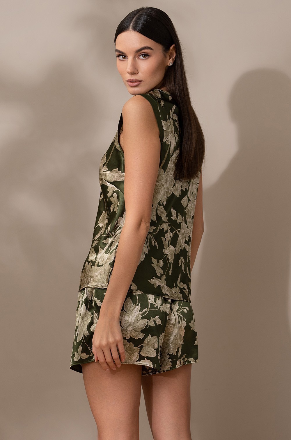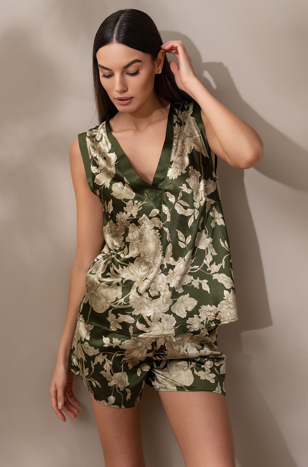 Пижама шёлковая топ на широких бретелях и шорты 5152 хаки Виттория Mia-Amore имеется в размерах S. M. L. XL. 2XL.3XL.