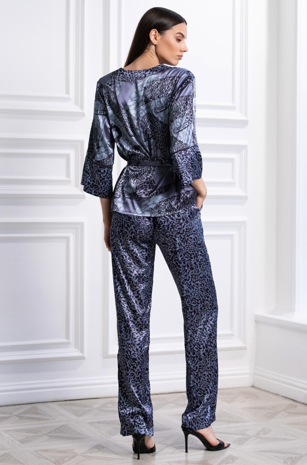 Брюки выполнены из мелкоузорчатого анималистичного принта, а жакет — из крупного анималистичного принта. Планка и манжеты обработаны тканью-компаньоном. Отделка в виде контрастного канта по краям борта и манжетам придаёт комплекту изысканный вид. По бокам брюк обработаны карманы.