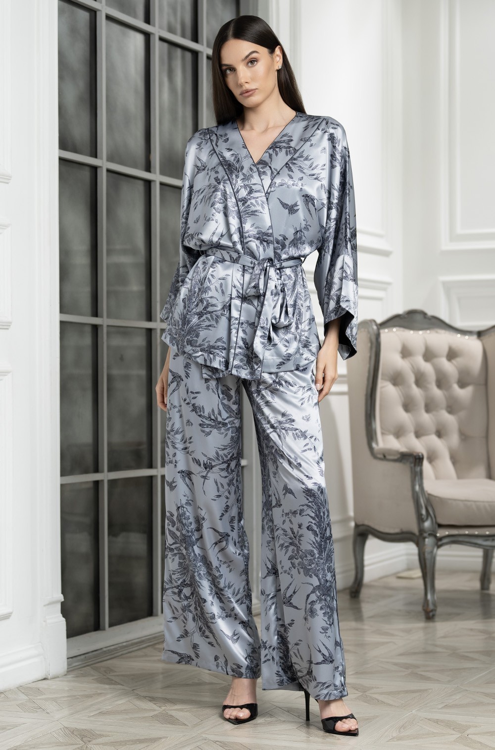 Шёлковая пижама запашной жакет брюки и топ Аргента 4235 Mia-Amore имеется в следующих размерах: S, M, L, XL, 2XL, 3XL.