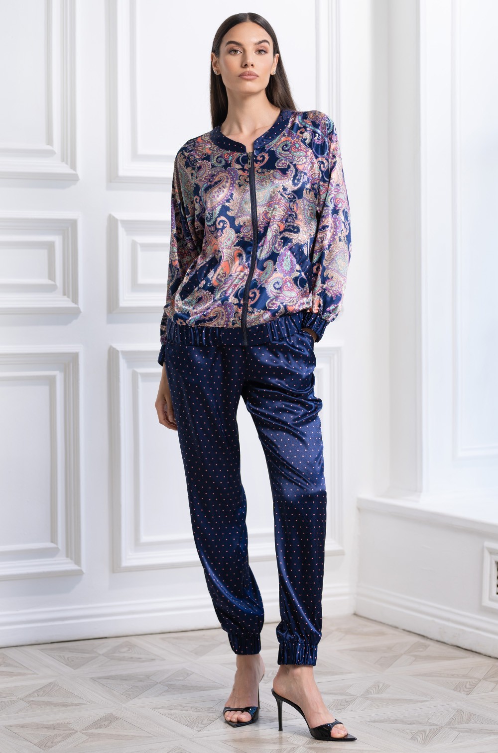 Эта пижама состоит из бомбера на молнии и брюк с манжетами на резинке по низу. Бомбер выполнен из принтованного смесового шёлка, а брюки — из шёлка с принтом-компаньоном. Горловина и манжеты бомбера декорированы шёлком-компаньоном, что придаёт изделию особый шарм.