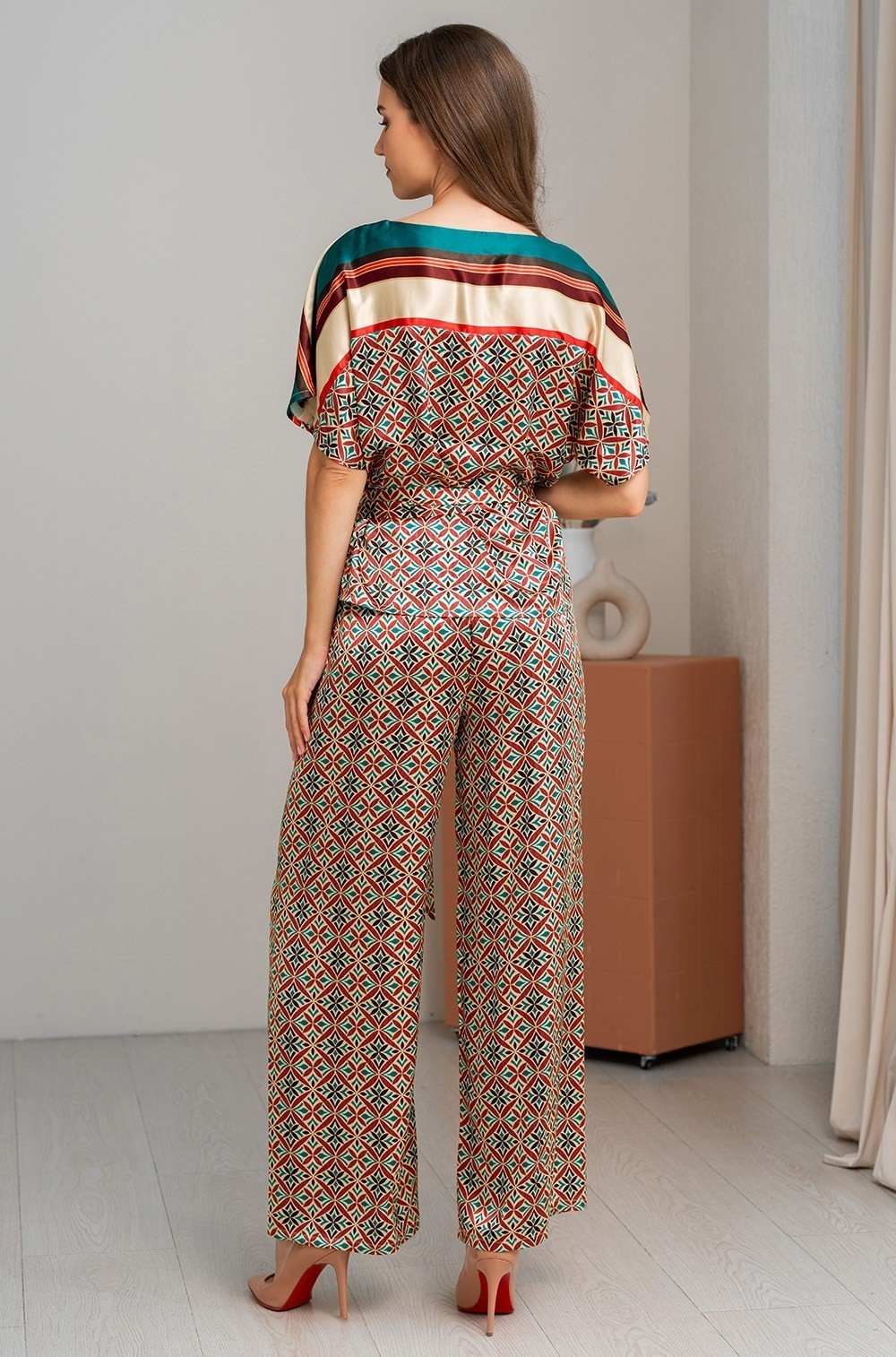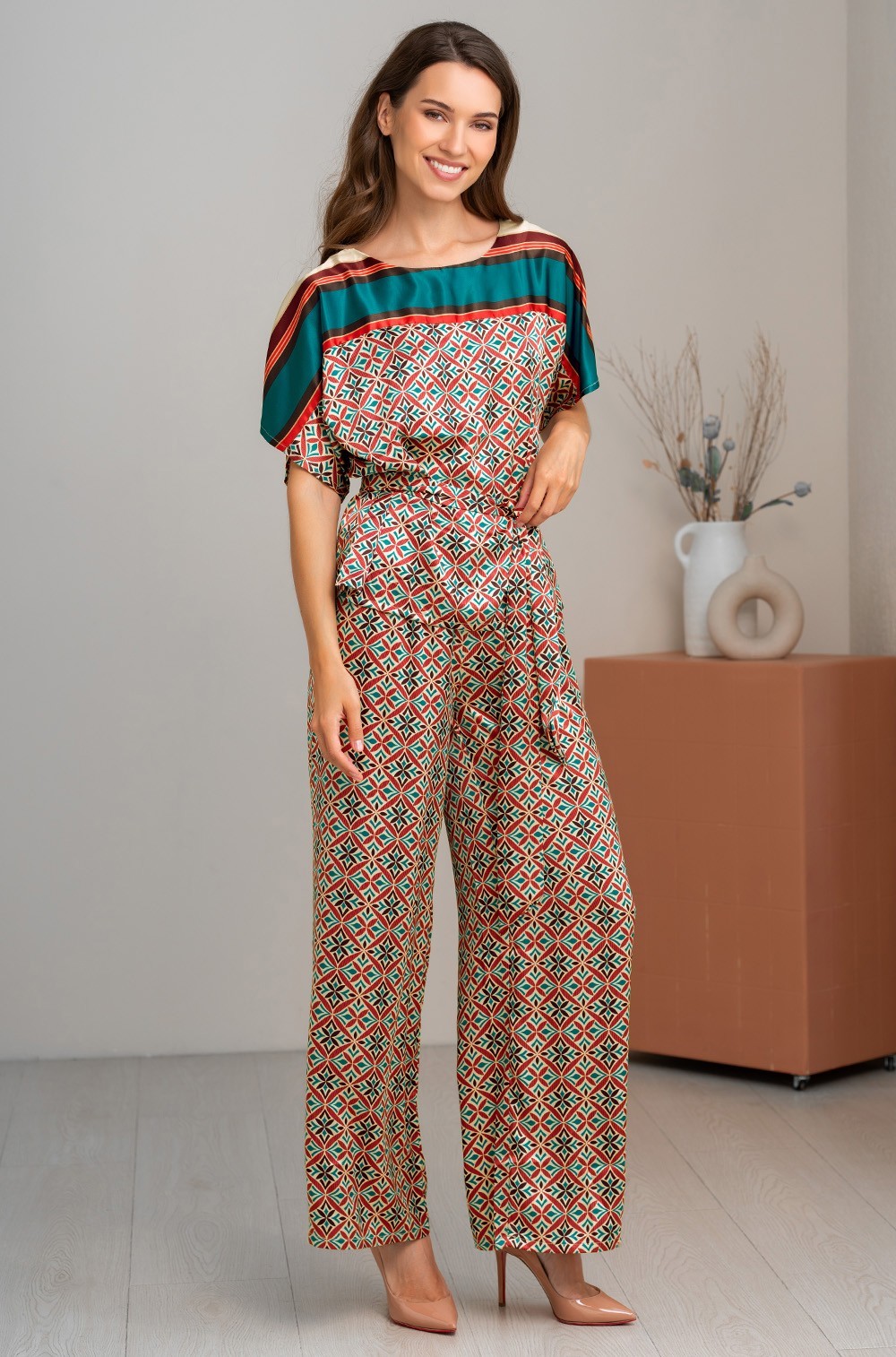 Шёлковый домашний комплект Brianna 4336 — это идеальное сочетание комфорта и стиля. Пижама Mia-Amore состоит из топа свободного силуэта с короткими рукавами и широких брюк-палаццо. Благодаря разным сочетаниям принтованного смесового шёлка, изделия комплекта выглядят роскошно и элегантно. Пояс, который идёт в комплекте, позволяет подчеркнуть линию талии. Состав пижамы — натуральный шёлк (70%), полиэстер (25%) и эластан (5%). Размеры доступны в трёх вариантах: S, M, L и 2XL, 3XL, чтобы каждая женщина могла выбрать подходящий размер. Шёлковый домашний комплект Brianna 4336 станет прекрасным дополнением к вашему домашнему гардеробу и подарит ощущение уюта и роскоши