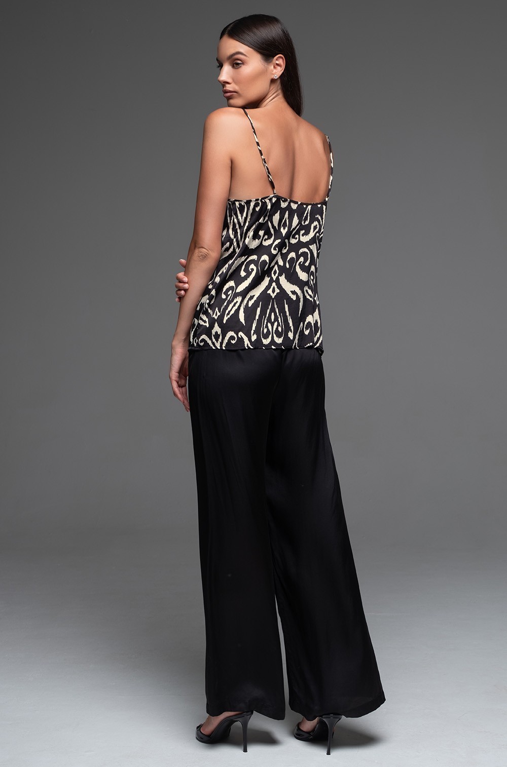 -Брюки: Брюки палаццо из чёрного вискозно-шёлкового полотна.