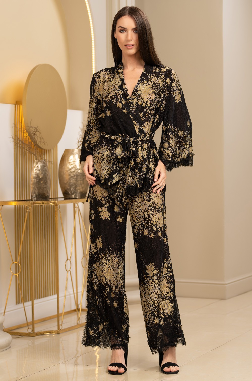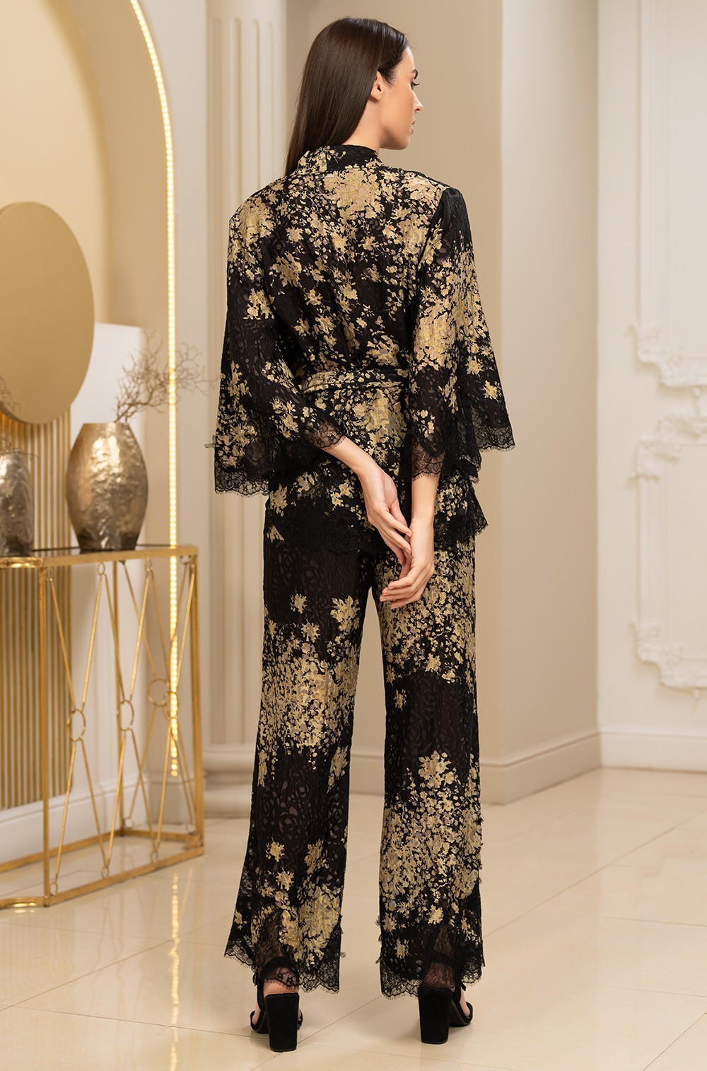 -По низу жакета, рукавов и по низу брюк отделка из чёрного ажурного кружева: Придает пижаме изысканность и соблазнительность.