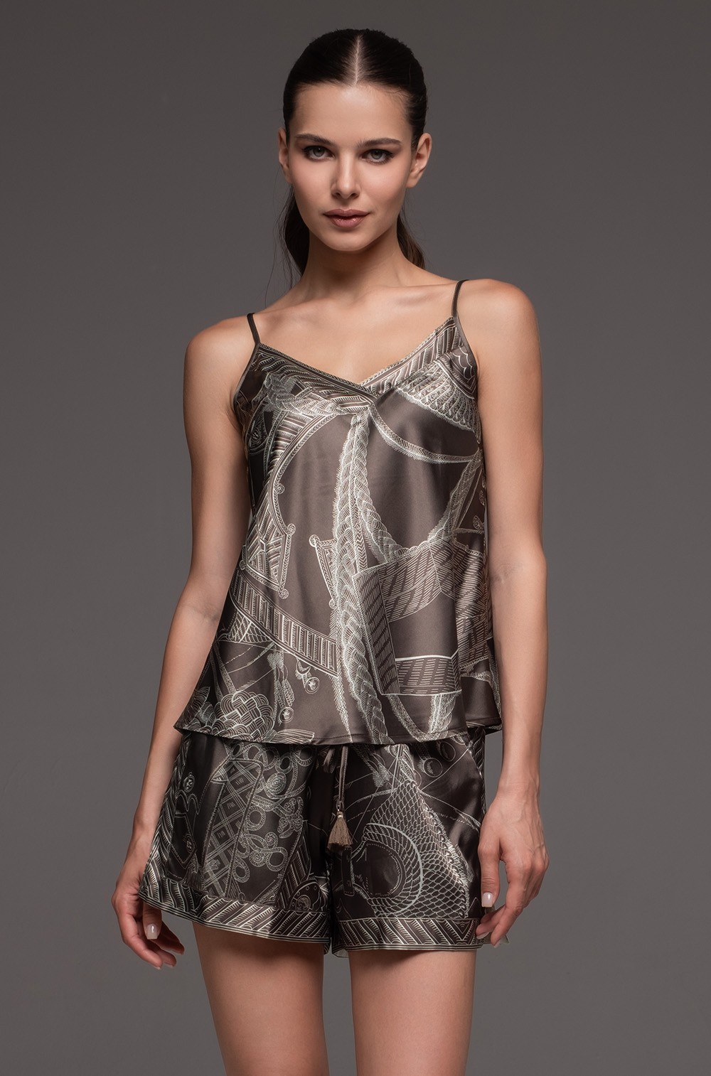 Aisha 4312. Пижама Mia-Amore состоит из топа на тонких бретелях и шорт, создавая идеальный комплект для комфортного сна и отдыха. Изделия выполнены из принтованного смесового шелка, что придает пижаме особый шарм и изысканность. По бокам шорт обработаны карманы, а по низу манжет расположены пикантные разрезы, обеспечивающие свободу движений и комфорт.