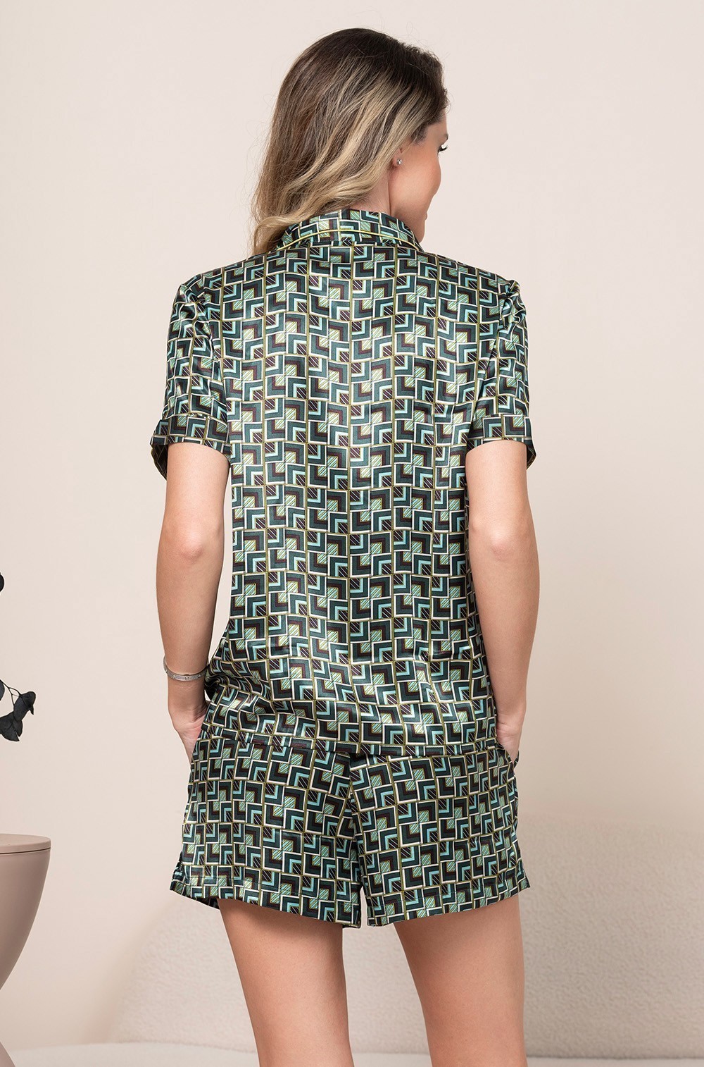 Bergamo 4382. Стильный домашний комплект Mia-Amore, состоящий из рубашки с коротким рукавом и шорт, создан для тех, кто ценит стиль и комфорт. Выполненный из принтованного смесового шёлка, этот комплект станет изюминкой вашего домашнего гардероба, обеспечивая при этом максимальный комфорт в повседневной носке. Борта и воротник рубашки украшены контрастными кантами, что добавляет изделию изысканности и утончённости. Короткий рукав делает эту модель идеальной для теплых дней, даря вам ощущение легкости и свежести.