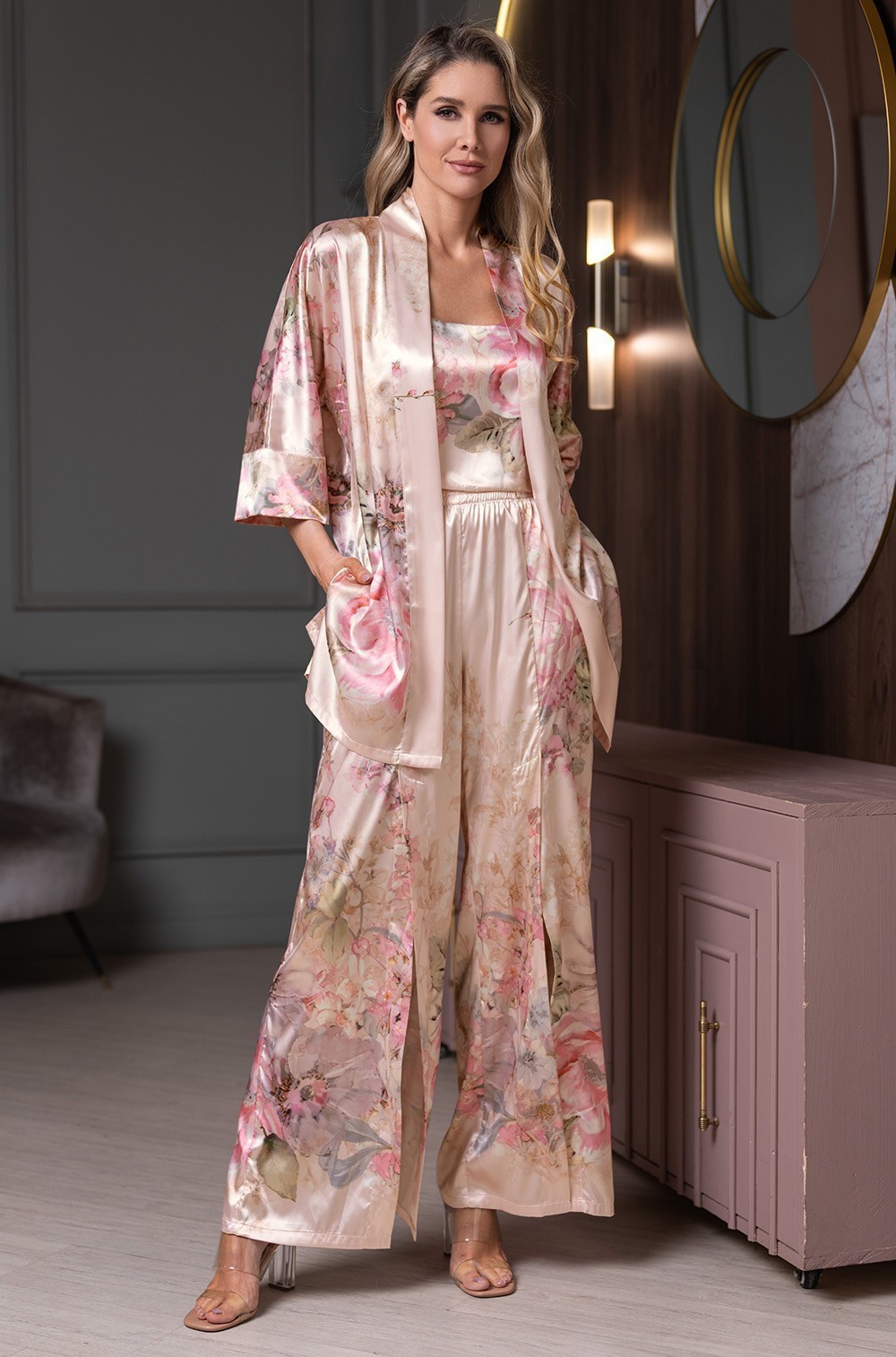 Тип Пижама с брюками Цвет Розовый Модель Комплект жакет, топ, брюки Материал Смесовый шёлк