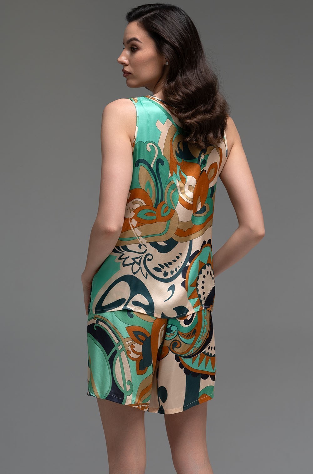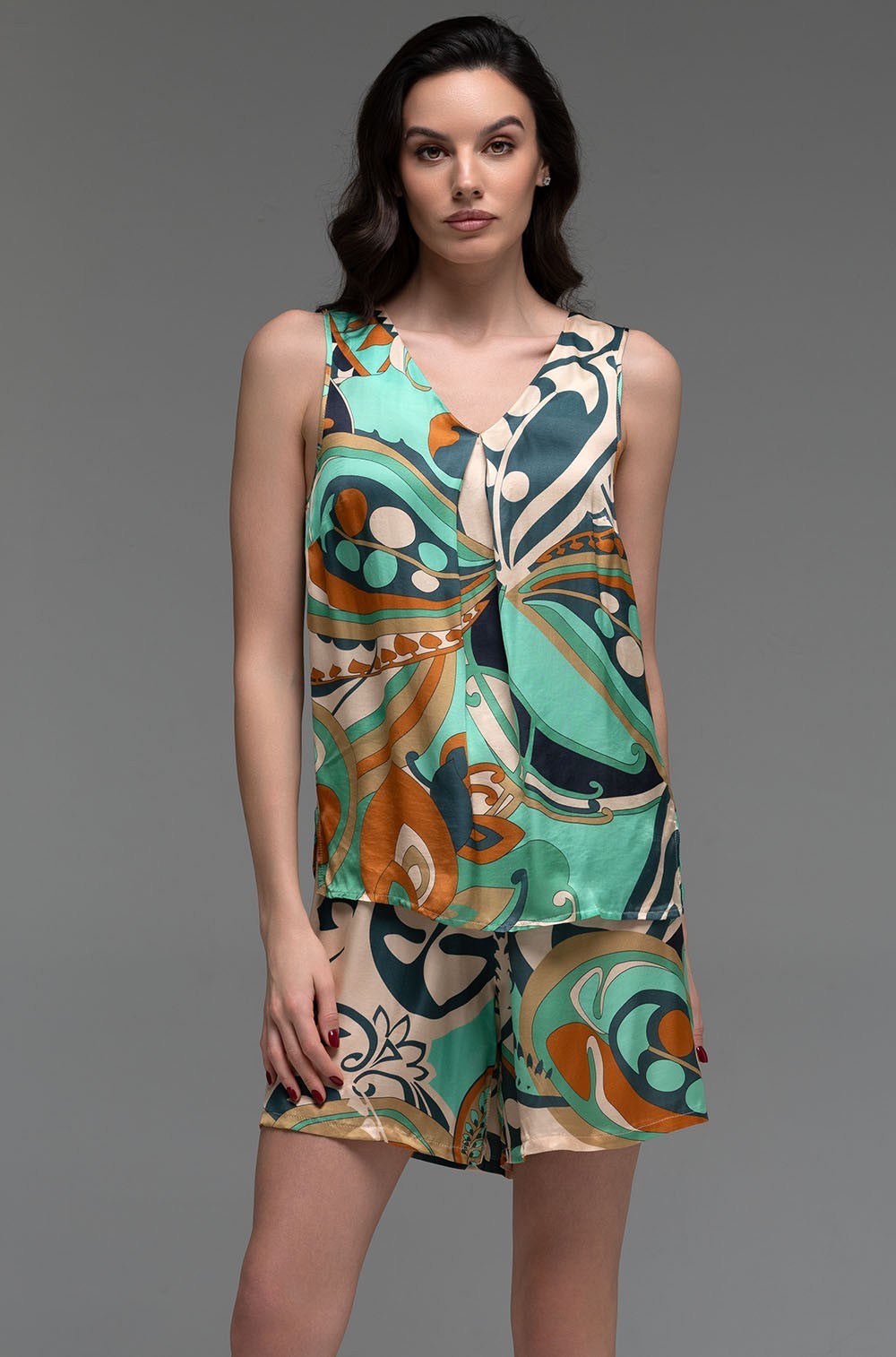 Изысканный комплект, состоящий из топа на широких бретелях и шорт, создан для тех, кто ценит комфорт и элегантность в каждой детали. Модель привлекает внимание стильным принтованным рисунком на премиальном смесовом шелке. Топ выполнен на широких бретелях, что обеспечивает комфортную посадку и поддержку груди. Модель идеально подходит для повседневной носки и отдыха.