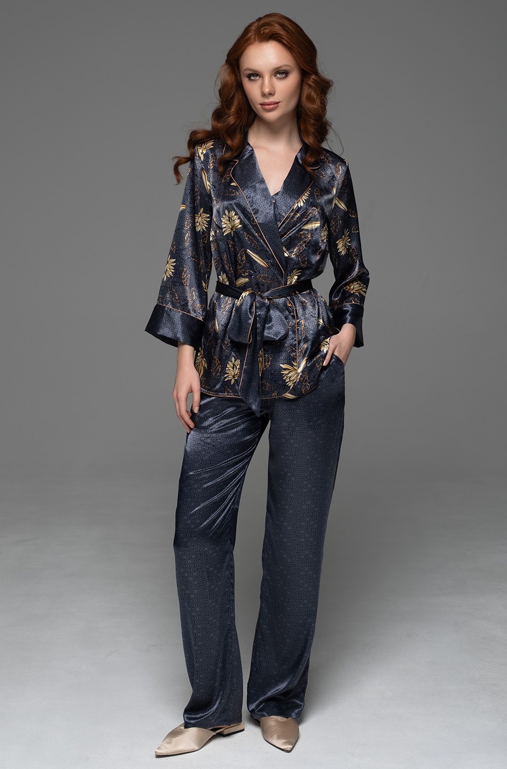 Тип Пижама с брюками Цвет Синий Модель Комплект жакет, топ, брюки Материал Смесовый шёлк
