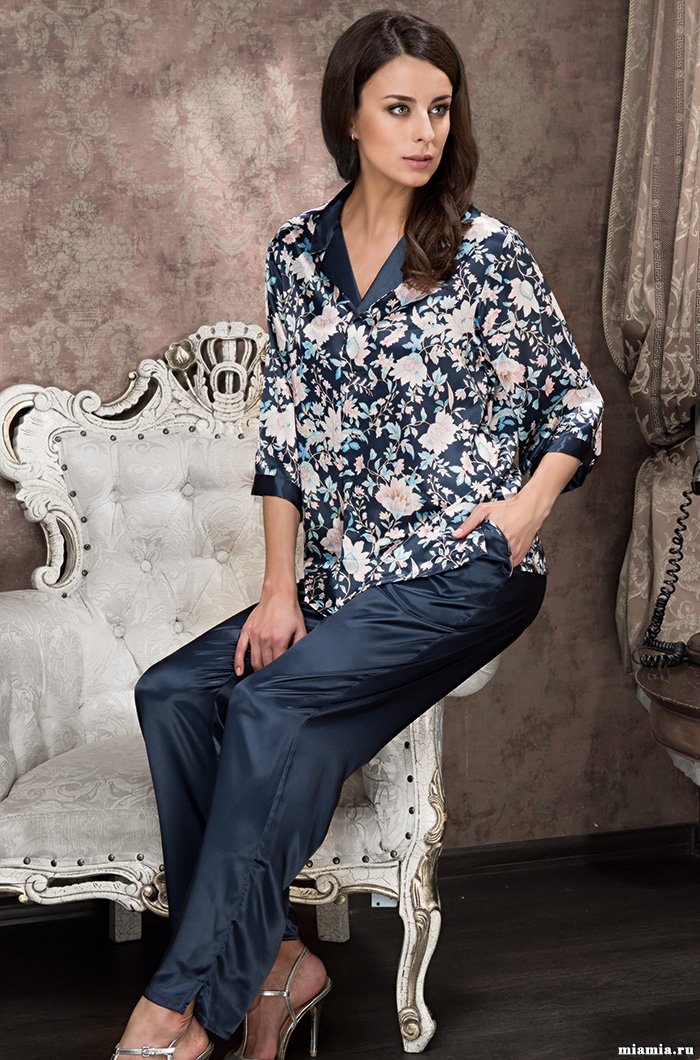 Комплект Mia-Amore состоит из блузы и длинных брюк. Блуза с застежкой на пуговицы выполнена из принтованного атласа, а брюки из однотонного.