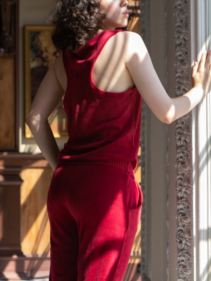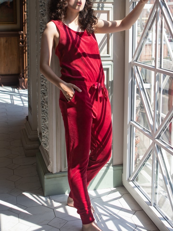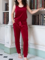 Женский комбинезон из домашней коллекции Opium. Выполнен из трикотажного бархатного велюра роскошного цвета бургунди. Заниженная линия талии оформлена кулиской на резинке и украшена шелковым бантом в тон. Удобные боковые карманы, брюки на манжетах. Эластичная ткань и достаточно свободный крой верха позволяют без труда снимать и надевать комбинезон. Стильная вещь для дома и отдыха.