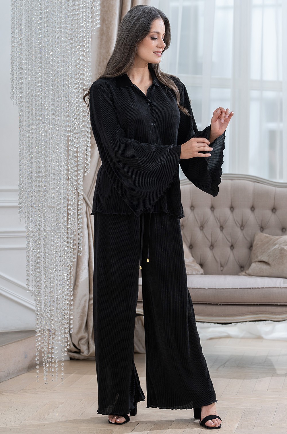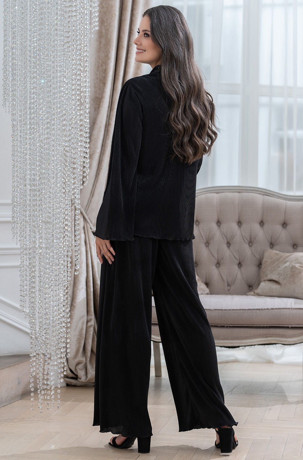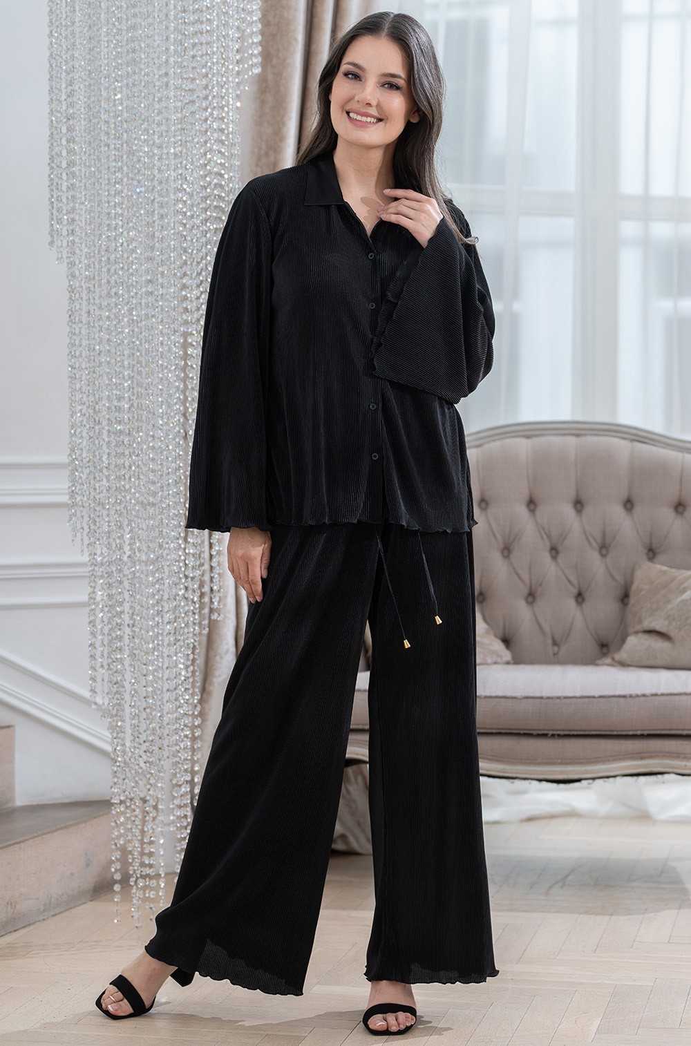 Шикарный брючный комплект домашний из плиссе чёрный Рокси 7376 Mia-Amore имеется в размерах: S. M. L. XL. XXL. 3XL.