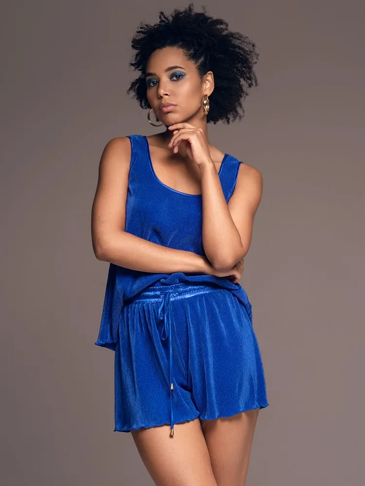 Пижама из плиссе синяя топ на широкой бретели и шорты Рокси 7374 Mia-Amore имеется в размерах: S. M. L. XL. XXL. 3XL.
