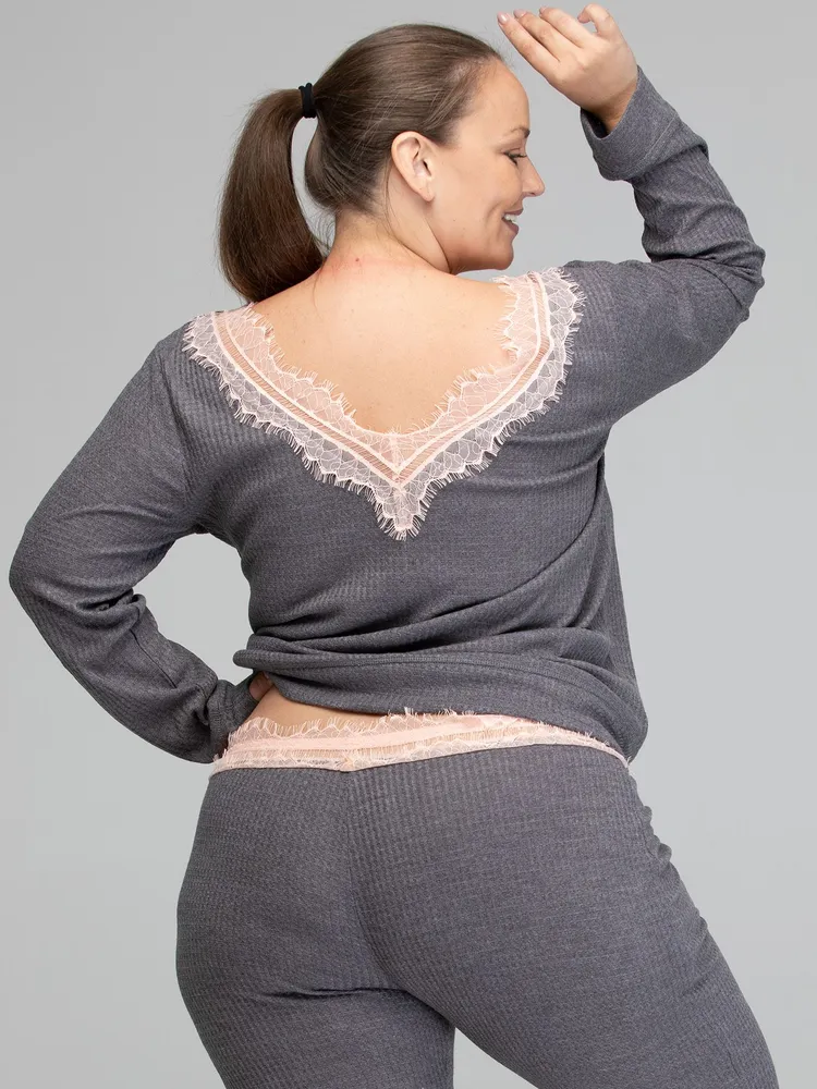 Футболка с длинным рукавом из коллекции OPIUM Home&Sleepwear, сшита из мягкой объемной «вафельной» серой ткани. Вырез, украшенный нежным розовым кружевом, изящно открывает шею и ключицы. Домашние штаны из объемной серой ткани, на манжетах, необыкновенно удобны и красивы. Нежная розовая кружевная резинка на поясе украшает и надежно, не смотря на кажущуюся невесомость, фиксирует это изделие на талии. Идеальный комплект, в котором Вы будете чувствовать себя уверенно, уютно и раскованно.
