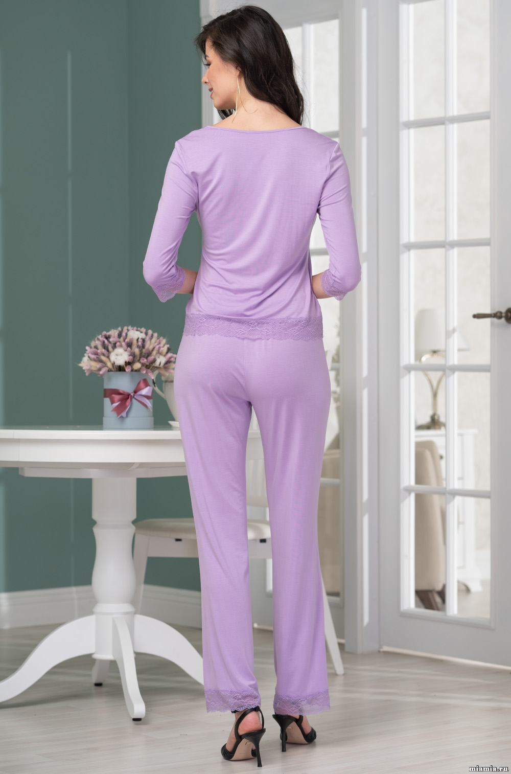 Брючный комплект Mia-Mella из нежного вискозного трикотажа лавандового цвета. Состоит из брюк и лонгслива с рукавами длиной ¾. Низ брюк, рукава и низ лонгслива декорированы кружевом.