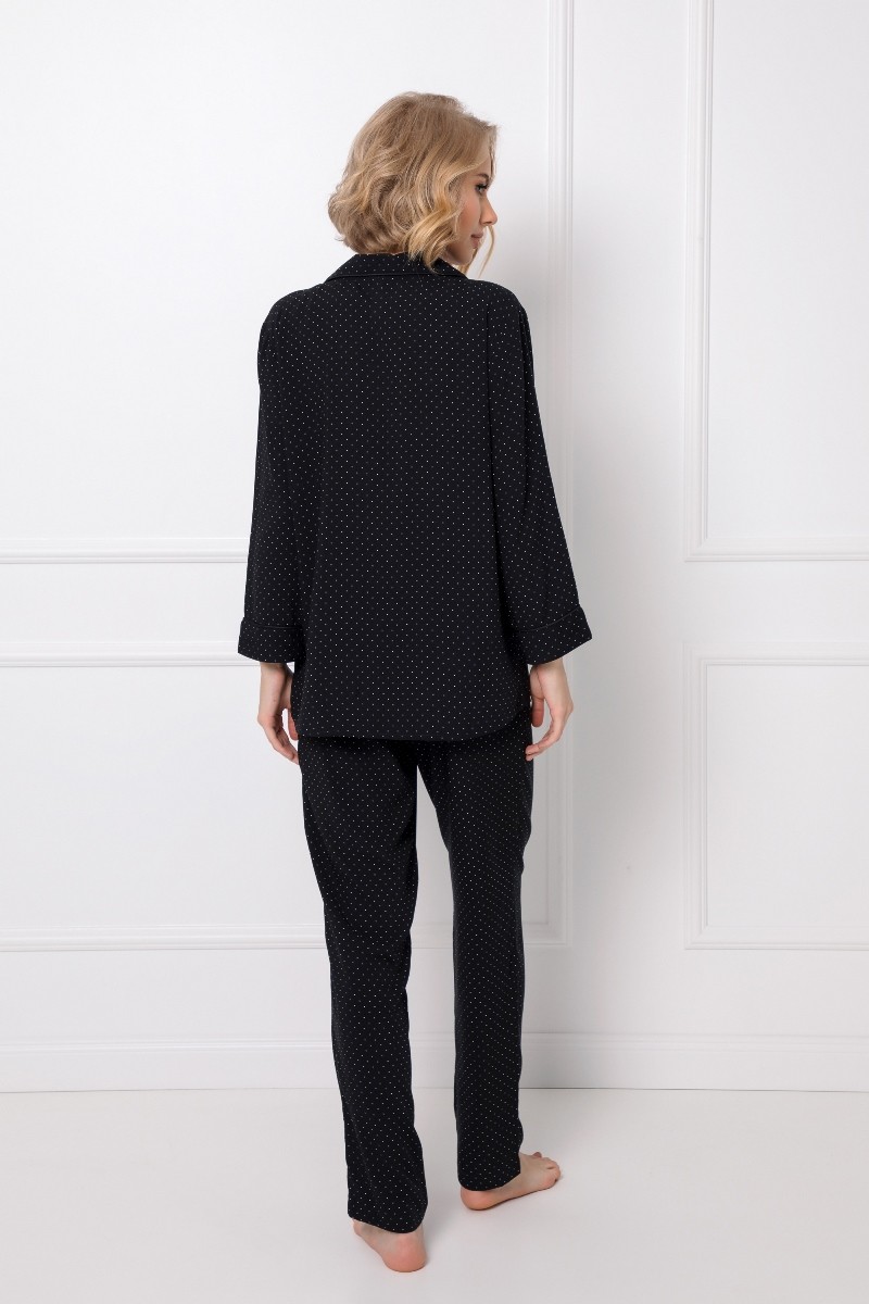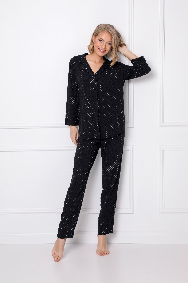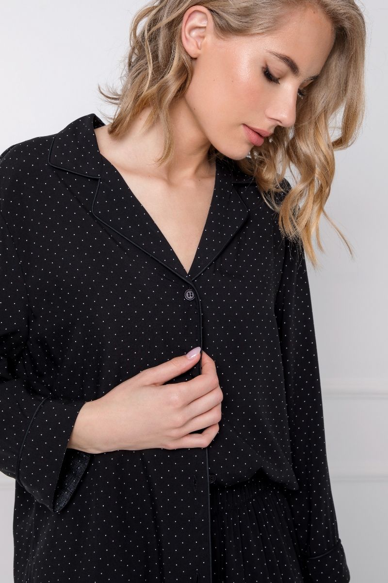 Элегантная и особенная пижама рубашечного типа Berthine, сделанная из шелковой вискозы. Воротник и рукава пижамы украшены черной атласной окантовкой. Штаны с эластичной резинкой на поясе. Узор ткани - мелкие белые точки.