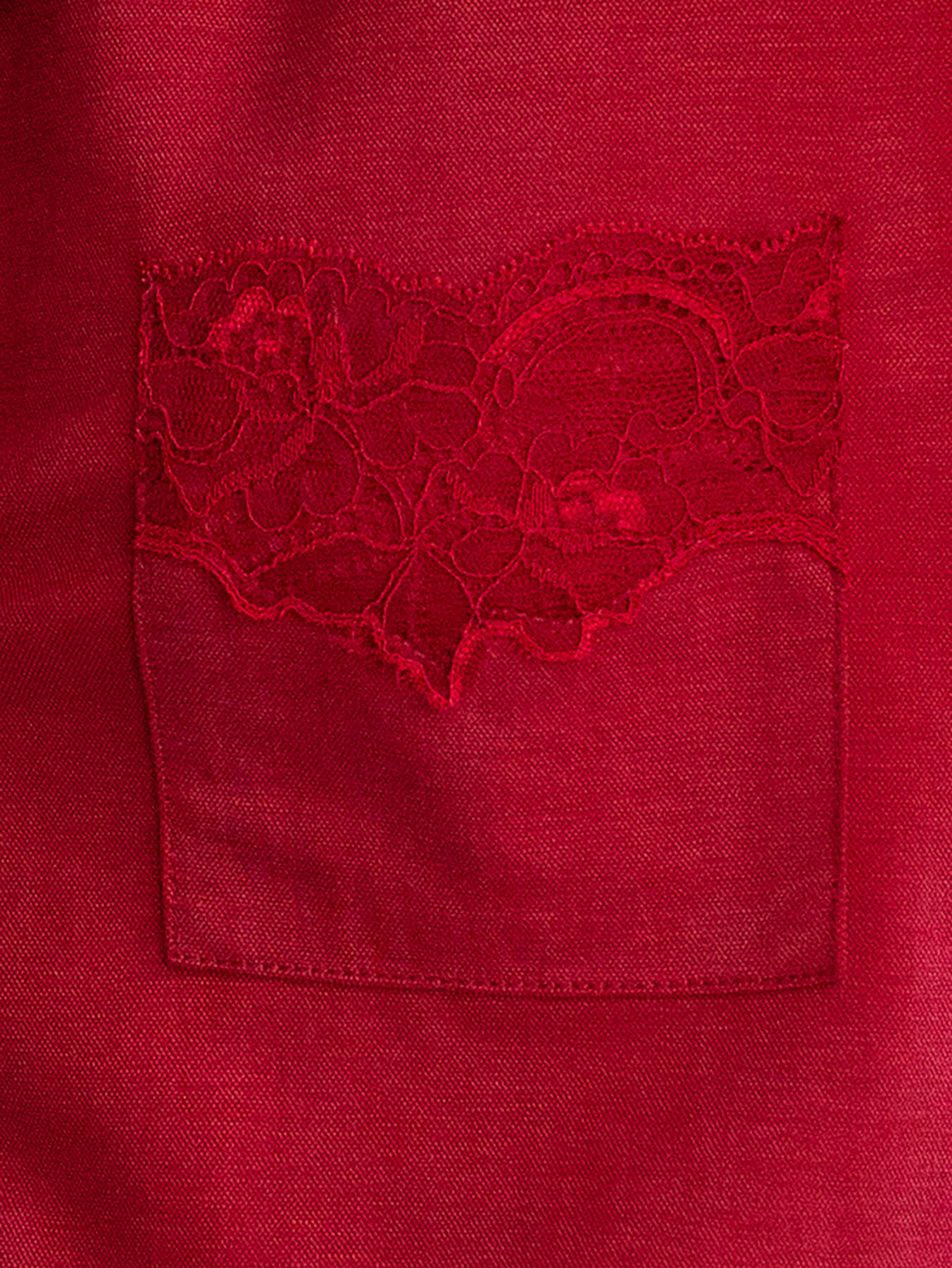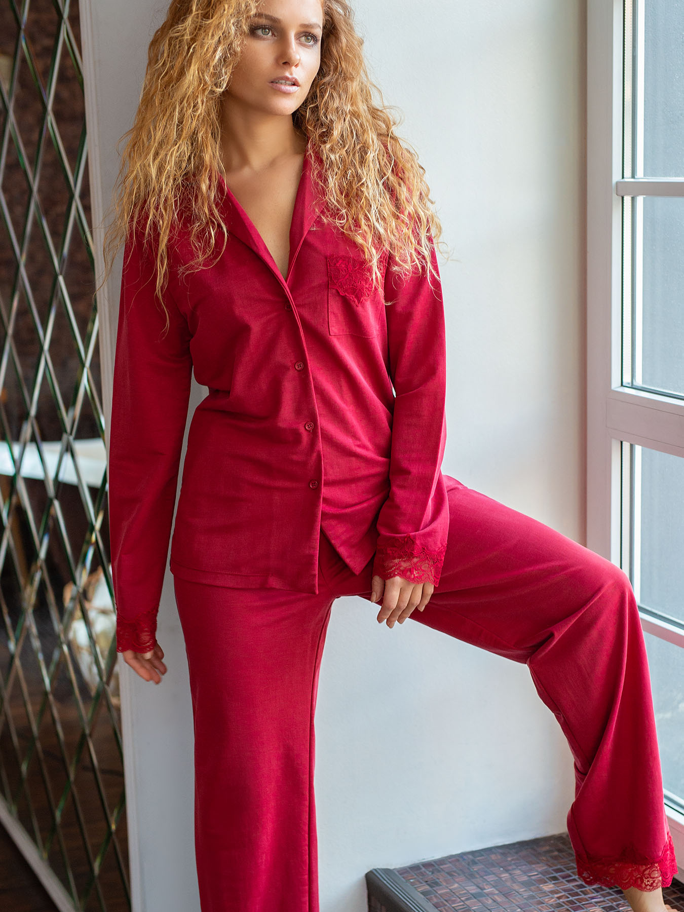 Изысканный комплект для дома: жакет и брюки роскошного цвета спелой вишни, с отделкой кружевом в тон. Жакет прямого силуэта, имеет застежку на пуговицах, маленький нагрудный кармашек, отложной английский воротник. Брюки свободного кроя на резинке. Этот богатый комплект выполнен из инновационной ткани, содержащий вискозу, но по тактильным ощущениям напоминающий натуральный шелк, необыкновенно мягкой, прохладной и освежающей, ласкающей тело. В этом костюме легко почувствовать себя королевой.