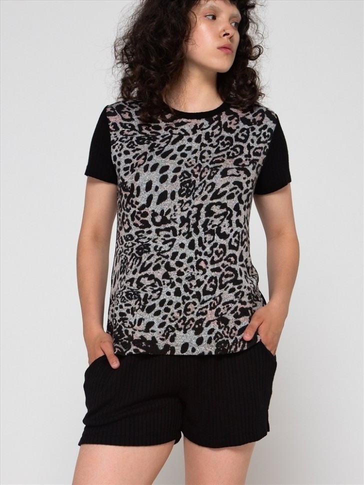 Женская пижама: шорты и футболка с леопардовым принтом. Удобные мягкие шортики на резинке, из вискозной ткани в рубчик, с внутренними боковыми карманами. Футболка скомбинирована из двух видов ткани: спинка и рукава как шорты, а перед из мягкого трикотажа с небольшим ворсом, с рисунком под леопарда. Модный анималистичный принт уравновешен нейтральным черным цветом комплекта.