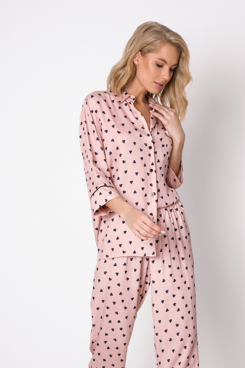 Пижама женская со штанами изготовлена из текстильной вискозы с легким блеском ткани. Пижама рубашечного типа, на пуговицах, с нагрудным карманом, рукава 3/4. Штаны свободного кроя, пояс на эластичной резинке.