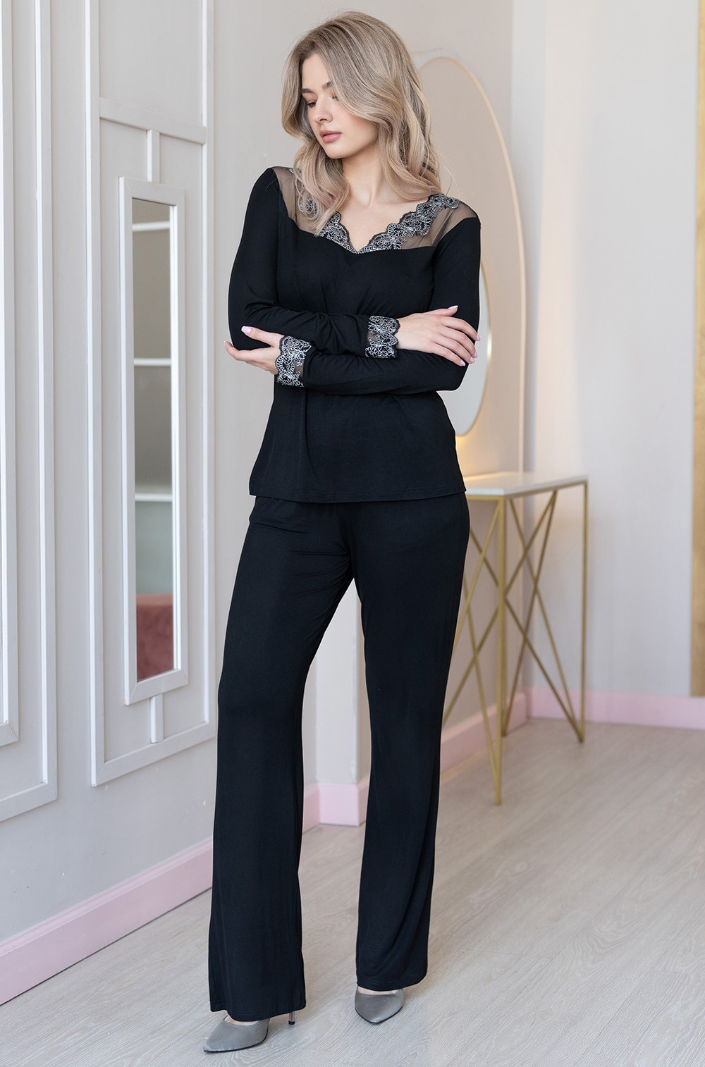 Комплект женский домашний чёрного цвета Mia-Amore состоит из длинных брюк и топа с длинным рукавом, выполнен из трикотажного полотна. По верхней части топа и низу рукавов расположено широкое двухцветное вышивное кружево. Брючный комплект в пижамном стиле незаменим для отдыха и сна, путешествий, также можно смело носить его на прогулку в качестве повседневной одежды. Он легкий и удобный. Костюм прекрасно подойдет для романтического ужина с парнем или мужем, провести нарядной семейные выходные дома или на даче, быть самой красивой на пижамной вечеринке с подругами. Идеальная посадка позволит подчеркнуть Вашу женственность, быть самой неотразимой и получать восторженные комплименты. Комплект красиво упакован, отлично подойдет для подарка родным и близким! Такой романтический и сексуальный кружевной трикотажный комплект из натурального материала - модала отлично подойдет для будущих мам. В нем она будет выглядеть красиво и модно.