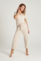 Женская пижама со штанами Eden бежевого цвета состоит из вискозы с примесью льна от европейского производителя Taro. Футболка с V-образным вырезом с коротким рукавом, брюки 7/8 с бантом. Пижама очень красивая и комфортная, также будет замечательной домашней одеждой и хорошим подарком для любимого или близкого человека.