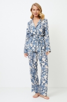 Брючная пижама Francine — это идеальный выбор для тех, кто ценит комфорт и элегантность. Она выполнена из лёгкой вискозы, которая обеспечивает комфорт и воздухопроницаемость в течение всей ночи. Топ с длинными рукавами и поясом застёгивается на пуговицы. У него привлекательный V-образный вырез горловины и манжеты рукавов, украшенные кантом. Брюки классического кроя имеют удобные карманы. Они выполнены в спокойном нежно-голубом цвете с очаровательным цветочным рисунком. Этот комплект привнесёт красоту сада в ваш спокойный сон.
