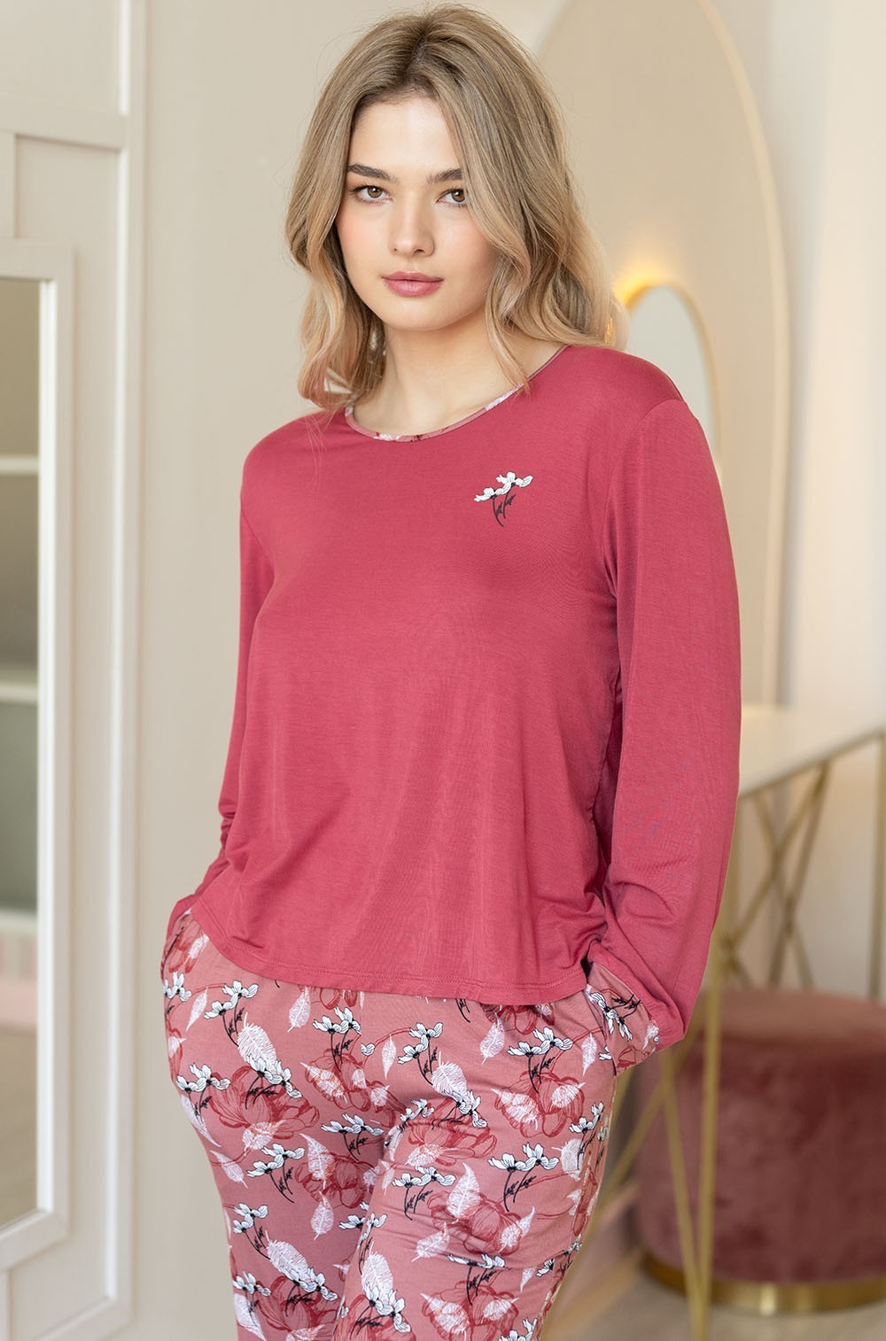 -Однотонный лонгслив: Спереди украшен небольшим монопринтом в виде цветка, что добавляет изысканности.